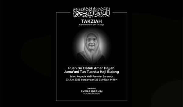 KUALA LUMPUR,23 Jun - Perdana Menteri,Datuk Seri Anwar Ibrahim menzahirkan rasa dukacita atas pemergian isteri kepada Premier Sarawak,Puan Sri Datuk Amar Hajjah Juma’ani Tun Tuanku Haji Bujang yang menghembuskan nafas terakhir awal pagi tadi.
