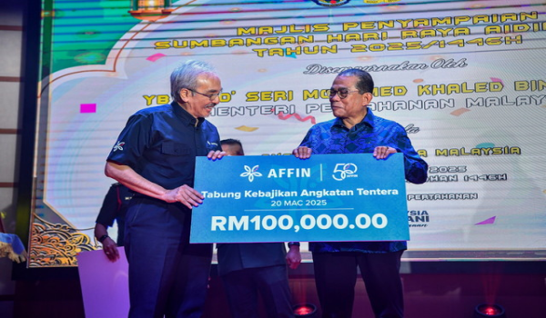 Menteri Pertahanan,Datuk Seri Mohamed Khaled Nordin (kanan) menerima mok cek sumbangan bernilai Rm100,000.00 daripada Pengerusi Affin Bank,Datuk Agil Natt (kiri) pada Majlis Penyampaian Sumbangan Hari Raya Aidilfitri 2025 / Foto Bernama