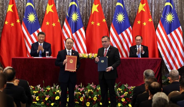 Perdana Menteri,Datuk Seri Anwar Ibrahim (kanan) bersama Presiden China,Xi Jinping (kiri) menyaksikan Majlis Pertukaran Memorandum Persefahaman antara Kerajaan Malaysia dan Kerajaan China,yang diwakili oleh Menteri Pengangkutan,Anthony Loke (dua,kanan) dan Duta Besar China ke Malaysia,Ouyang Yujing (dua,kiri) di Kompleks Seri Perdana,semalam/BERNAMA